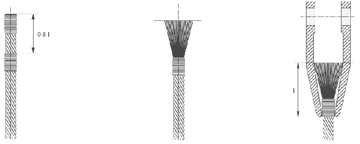 2. Клин и корпус этой муфты в паре представляют собой аналог клещей, зажимающих канат. Клиновая оснастка может заделываться специалистами самой эксплуатационной организации, так как монтажные операции просты и могут проводиться без применения специального оборудования. Однако собранный узел перед вводом в эксплуатацию необходимо проверять. Перед монтажом зажим, клин и штифт осматриваются на предмет наличия дефектов. Изношенная оснастка должна заменяться новой. Допускается использование муфт только с тем типоразмером троса, на который они рассчитаны. Нагружаемая часть каната должна устанавливаться только по центру штифта. Перед забиванием клина нужно нагрузить его канатом. К данной муфте нельзя прикладывать боковые нагрузки.