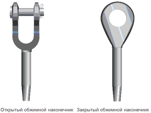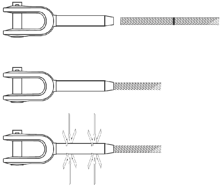 3. Обжимные муфты используются в основном с канатами поперечной свивки. Они изготавливаются из высокомарочной прутковой стали и выполнены сфероидными для облегчения монтажа. Принцип сборки узла прост: трос вставляется в оснастку, которая затем обжимается специальной пресс-машиной. Данную монтажную операцию должен проводить специалист, обладающий соответствующей квалификацией для работы с прессовым оборудованием. При соблюдении всех правил обжима обеспечивается достаточная прочность узла.
