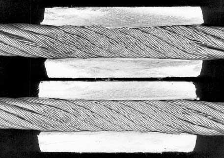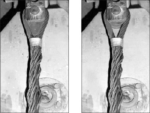 Ниже можно посмотреть (Рис. 17 и 18) как ведут себя стальные канаты крестовой и односторонней свивки после опресовки алюминиевой втулкой.