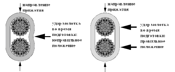 Перед транспортировкой под пресс, проволочные канаты часто подготавливаются на верстаках. С целью предотвращения соскальзывания втулки во время транспортировки, ее временно фиксируют на линиях каната при помощи молотка, тисков или гидравлических устройств (Рис. 13 и 14)