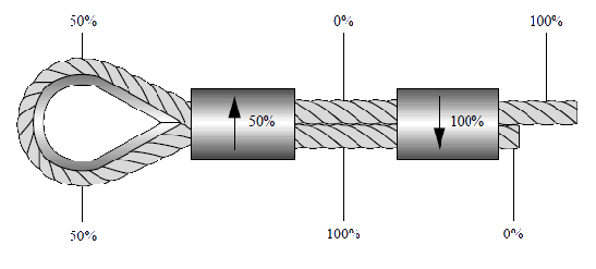 При квазистатистическом тестировании на растяжение, стропы опресованные алюминиевой втулкой выдерживают от 85% до 100% разрушающей силы используемого стального каната. В испытании на усталость при растяжении они выдерживают – в среднем – около 60% от числа циклов растяжения канатных зажимов. Рабочие температуры для алюминиевых втулок на стальных канатах с органическими сердечниками, колеблются между -60ºС и +100ºС. Допустимые рабочие температуры для алюминиевых втулок на стальных канатах со стальными сердечниками составляют от -60ºС до +150ºС.