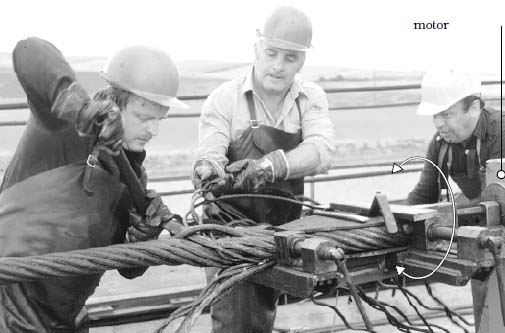 При заплетке стальных канатов большего диаметра, физической силы часто бывает недостаточно для поднятия поверхностных прядей. В таких случаях, используется гидравлическое шило для заплетки каната. Для облегчения поднятия прядей, иногда канаты в зоне сплетения распускаются механически. После того как прядь вставлена, канат снова заплетают. На Рис. 7 показаны заплетчики, работающие с устройством, которое может поворачивать конец каната при помощи мотора.