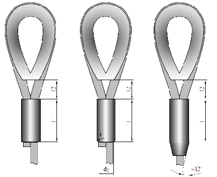 При наличии коуша, расстояние после опресовки между втулкой и коушем должно составлять два диаметра каната. При использовании втулок типов А и В, конец каната должен выступать из втулки. С типом С конец каната помещается в цилиндрической части втулки и остается видным сквозь ее окошко.