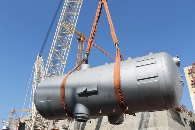 Первый парогенератор (вес более 330 тонн, диаметр - 4,5 м, длина - 14,0 м) доставлен автотранспортом с площадки тяжеловесных грузов строящейся атомной станции и поднят краном Demag (самый мощный из применяемых на строительстве АЭС в России) на транспортный портал.